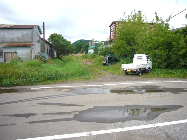 駅の南側にあった踏切の跡が、市街の道の横にコブのように半円を描いて残っている。