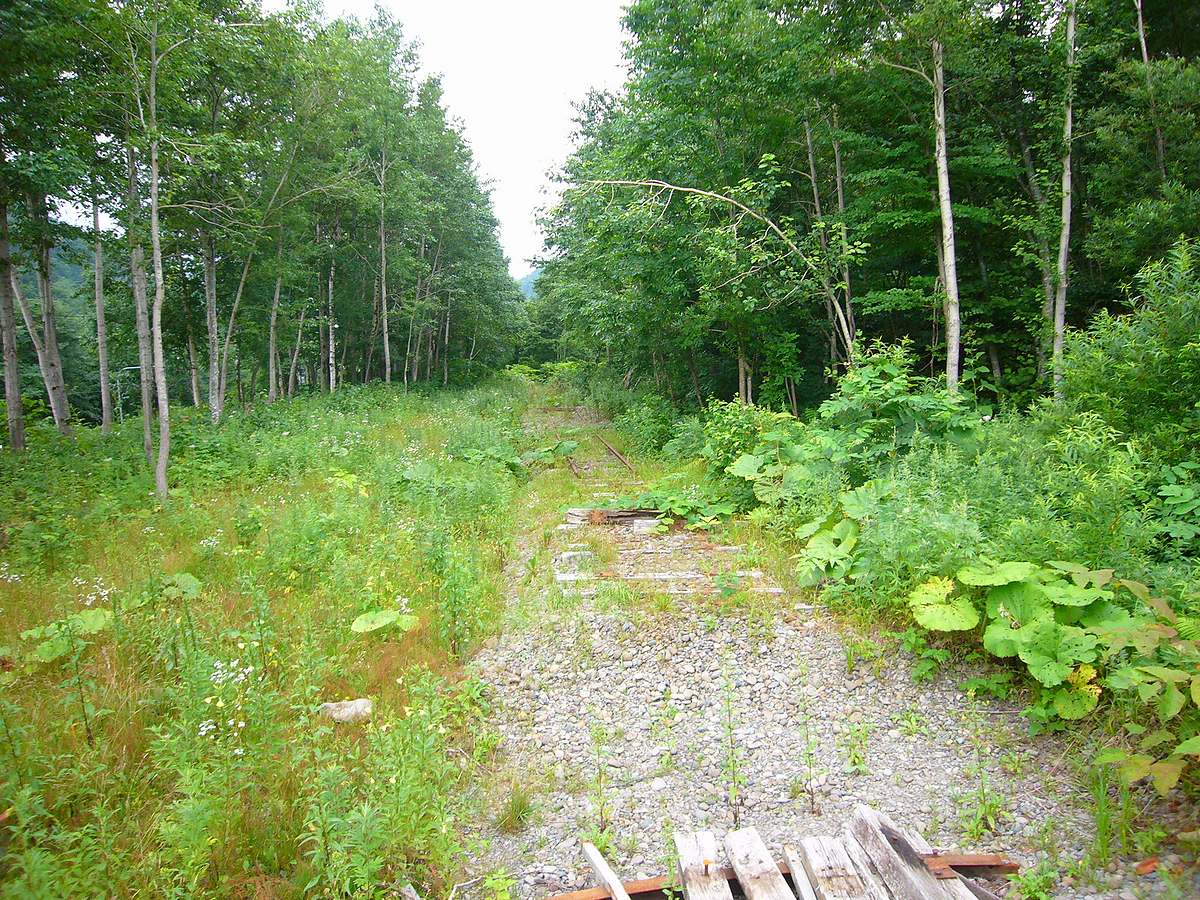 「トロッコ王国」の折り返し場から美深方面を望むと、白樺の林の中を下っていく路盤が途切れている。