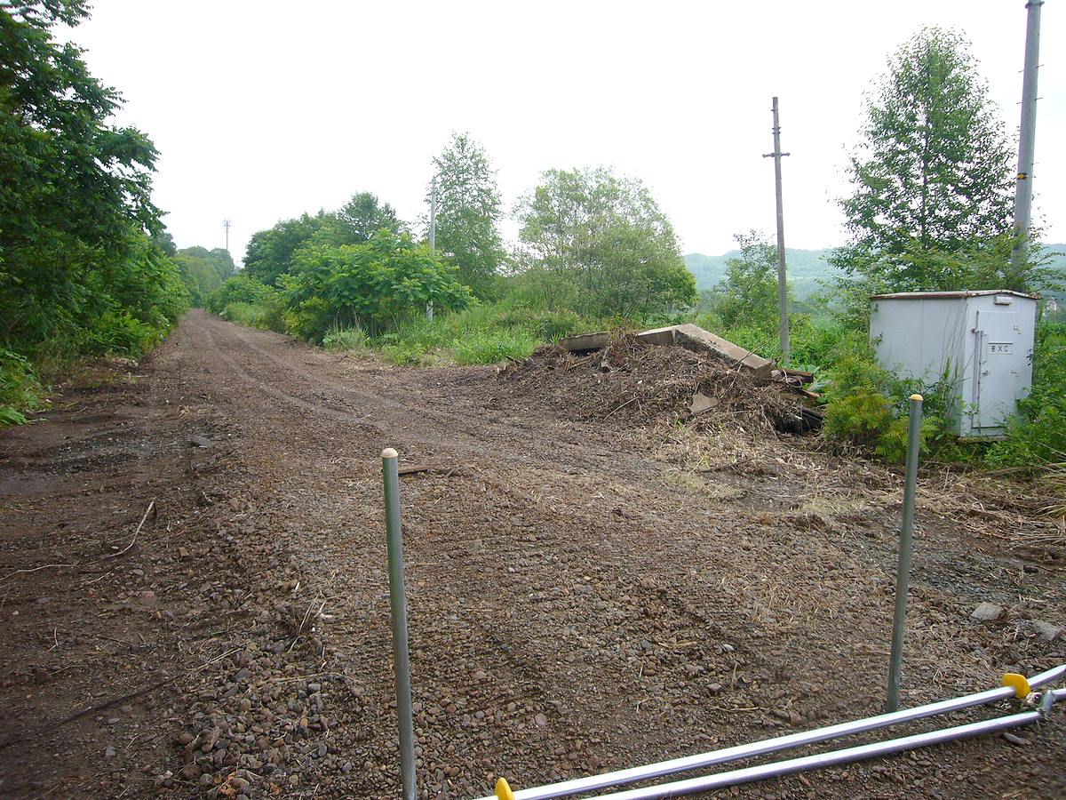 すでに残骸のみとなったホームとレールも枕木も外された空虚な路盤。