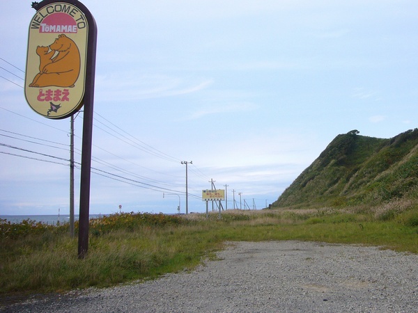 崖側に膨らんで微妙なカーブを描く路盤跡、Welcome to 苫前の看板が高くそびえ立つ。