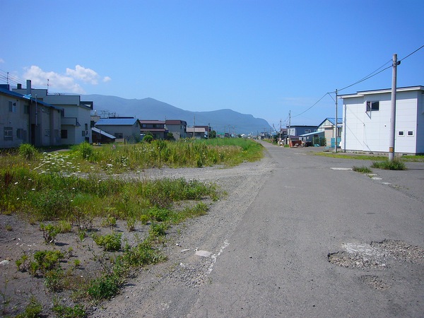 駅跡はきれいに整備され、鉄道の面影はまったく消えたが、その手前の、駅に向かう路盤跡は道路に挟まれて駅方向へと伸びる。