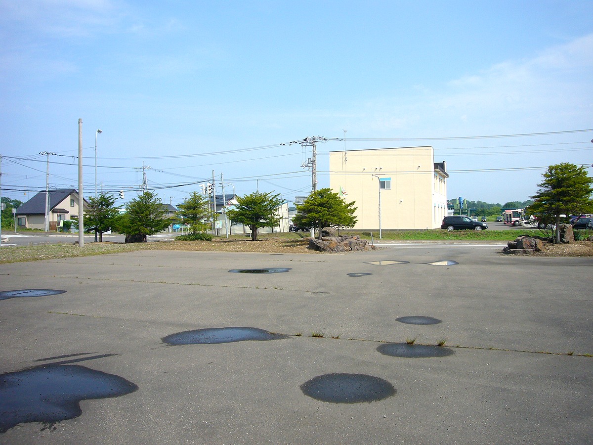 廃線後に駅敷地を分断するように設けられた道路を挟んで、バス会社敷地と公園に。