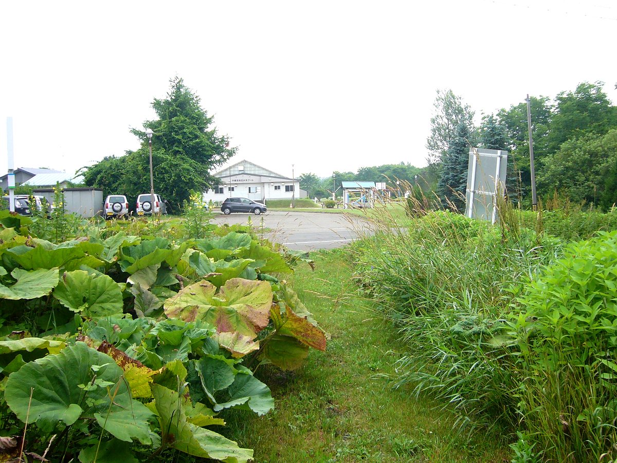 手前から続く路盤跡は、春別ヘルスパークの広大な敷地へと飲み込まれていく。