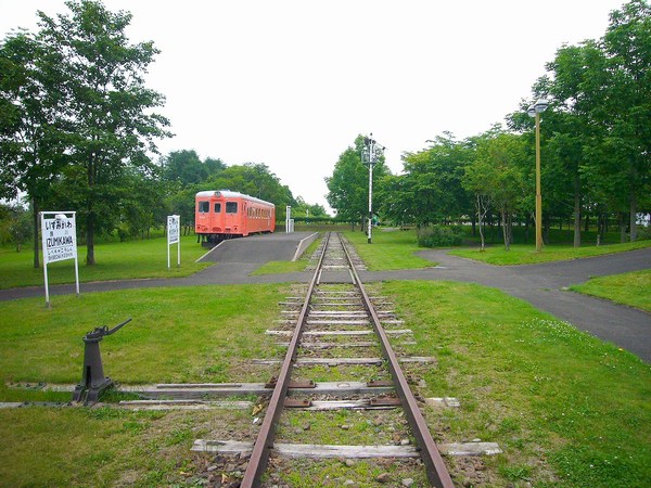 駅前通をはさんでAコープと鉄道記念館が並び、公園にはD51蒸気機関車とキハ22。