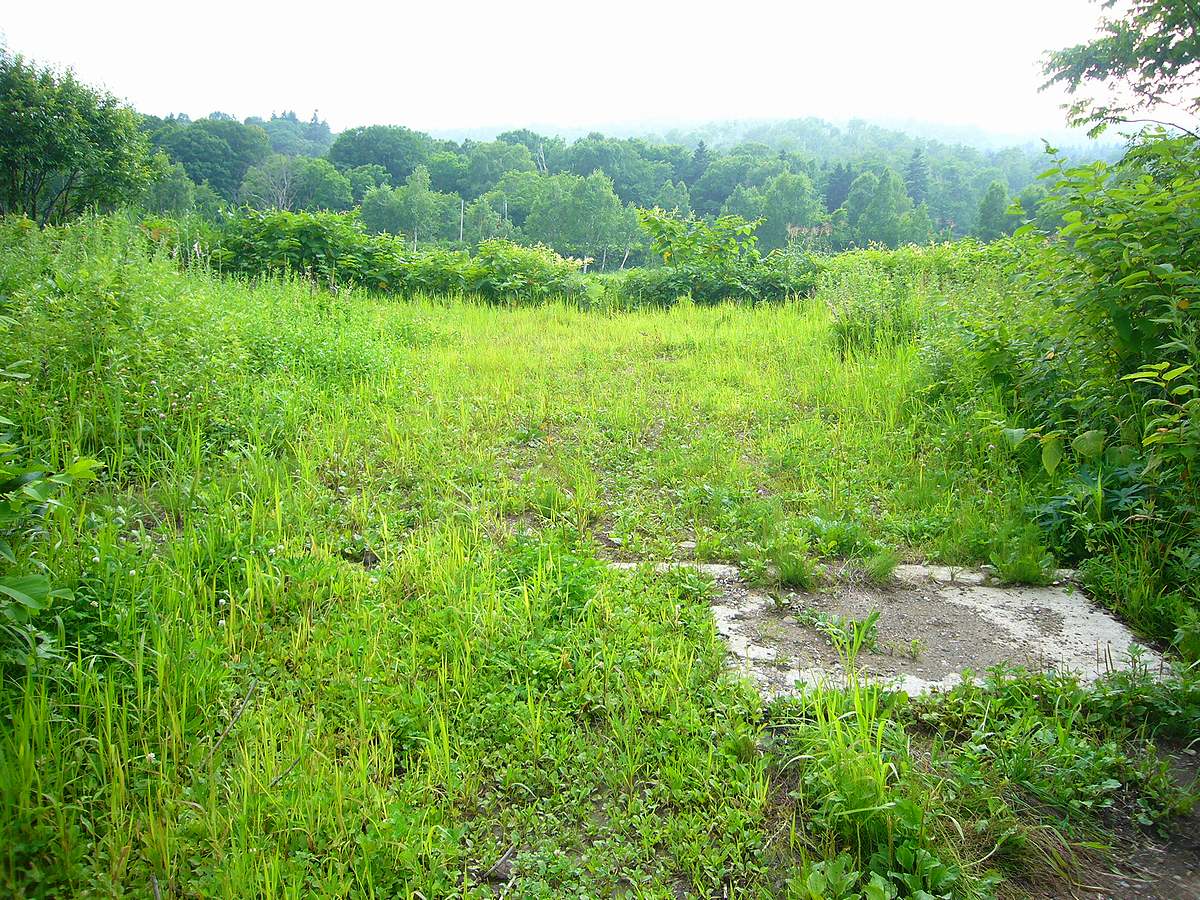 手前の足元に残る基礎部分は、駅舎の跡か、それとも違う建物のものか。