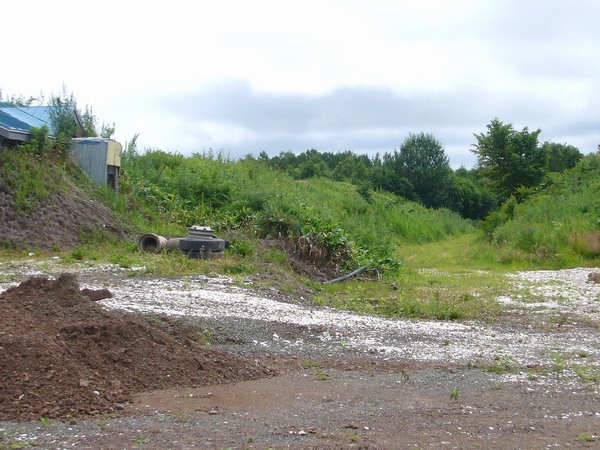 はっきりとわかる谷間に続く路盤跡。ここまでほぼ平らなところを走ってきて、最初に目につく地面の造作。