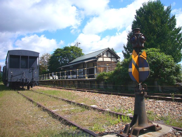駅舎にホームに構内線路が一式綺麗に残され、ワムとトラとヨが仲良く佇む。